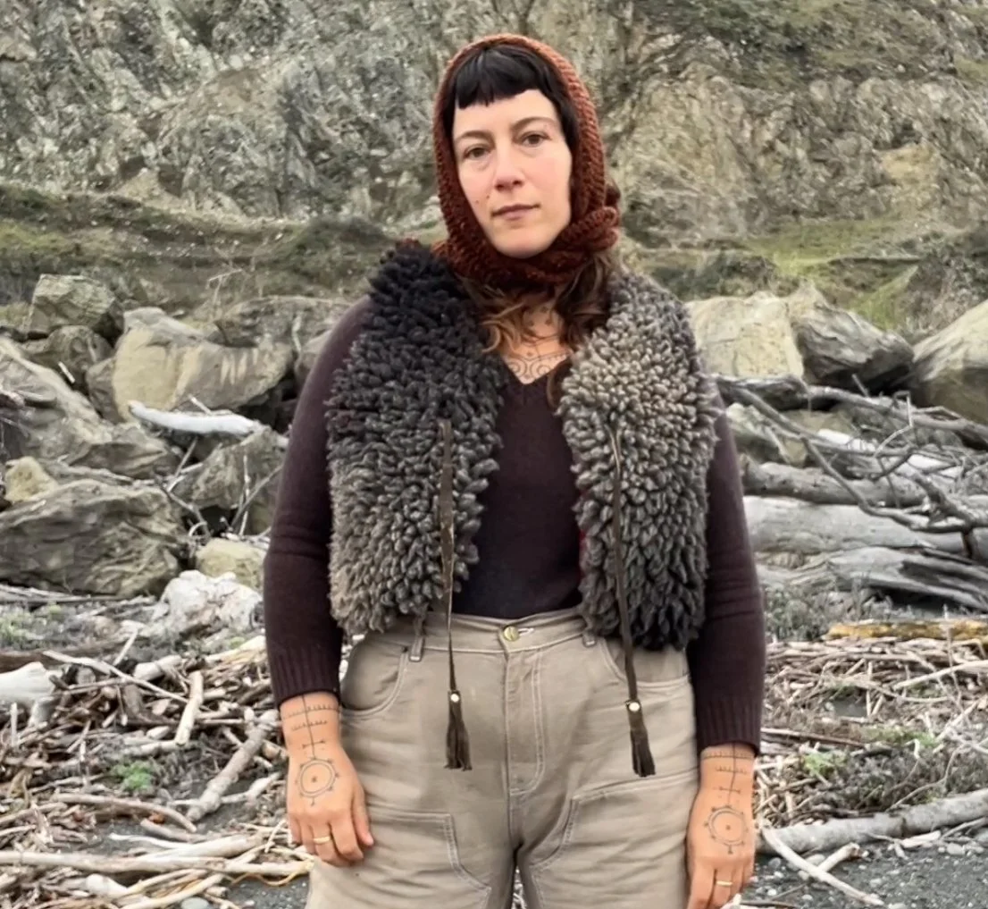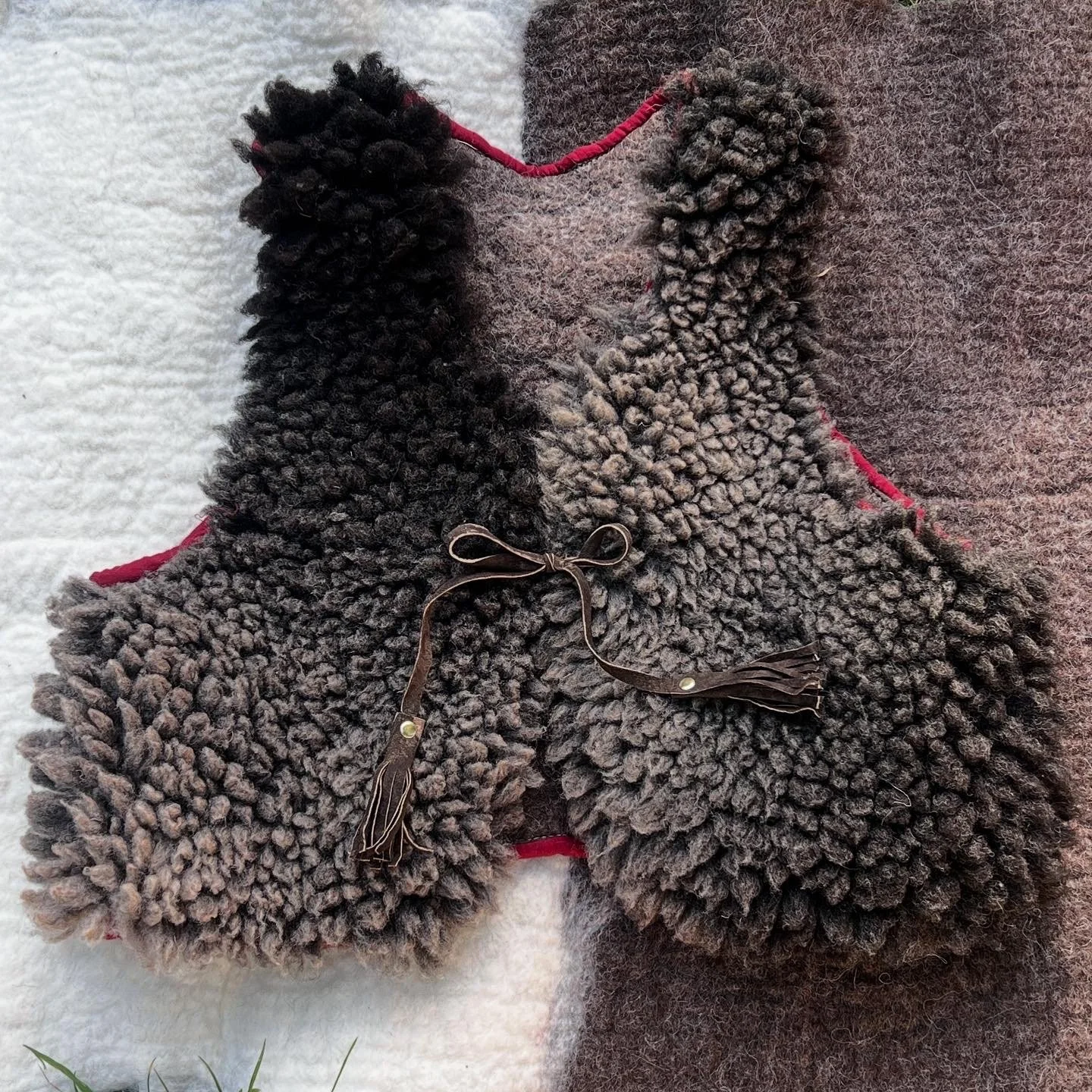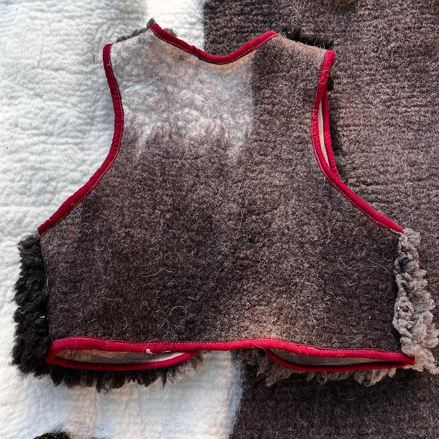 naturally tanned sheepskin and hand felted wool vest is reversible and can be worn with wool out for extra weather protection (wool is water resistant!) or wool in for ultimate warmth. trimmed with maroon cotton and closed with a simple buckskin tie with tassels.