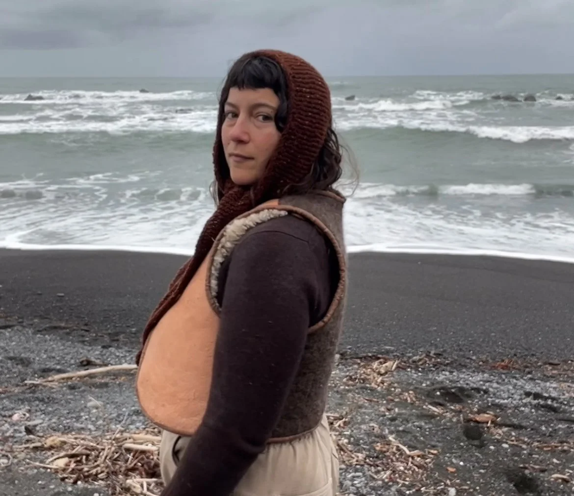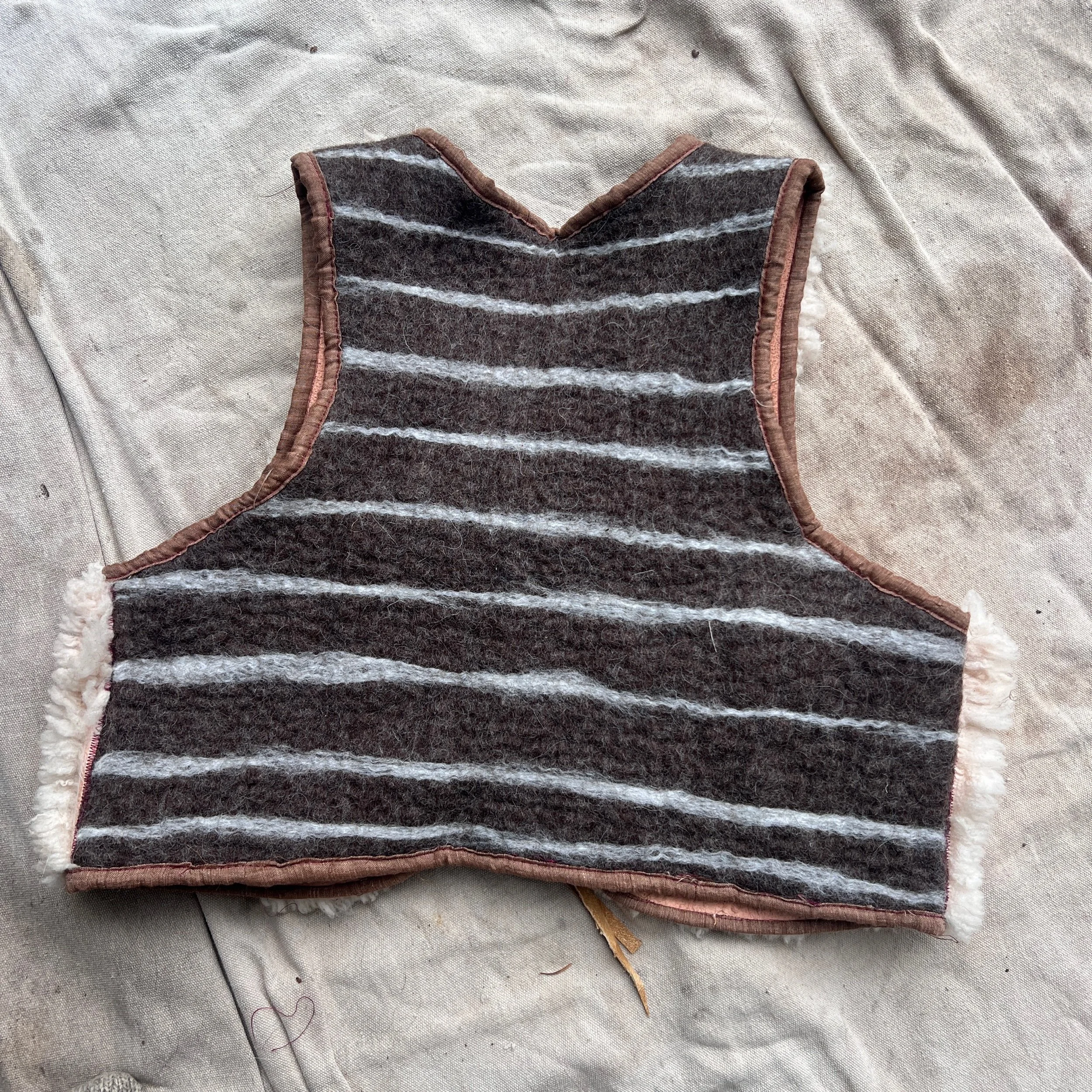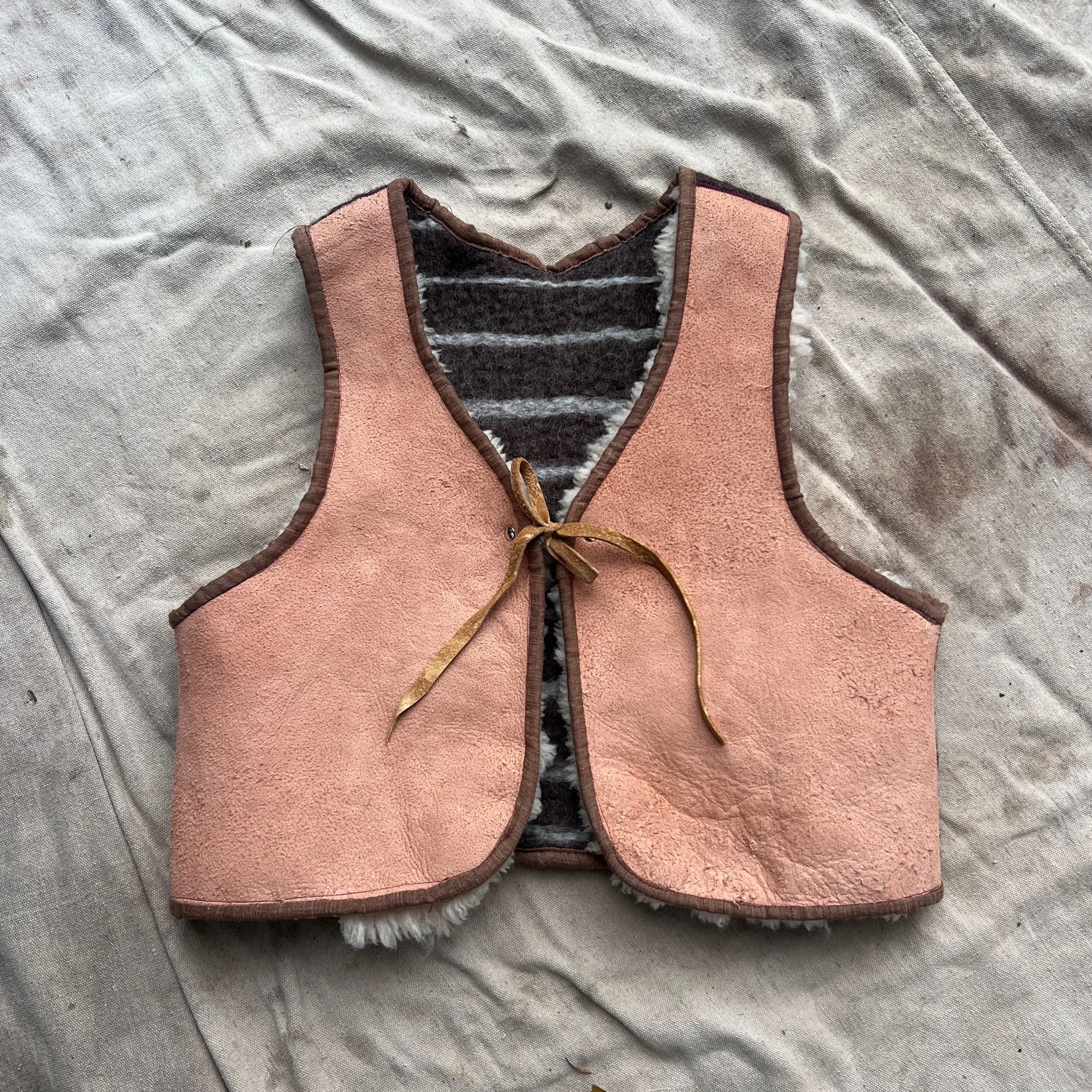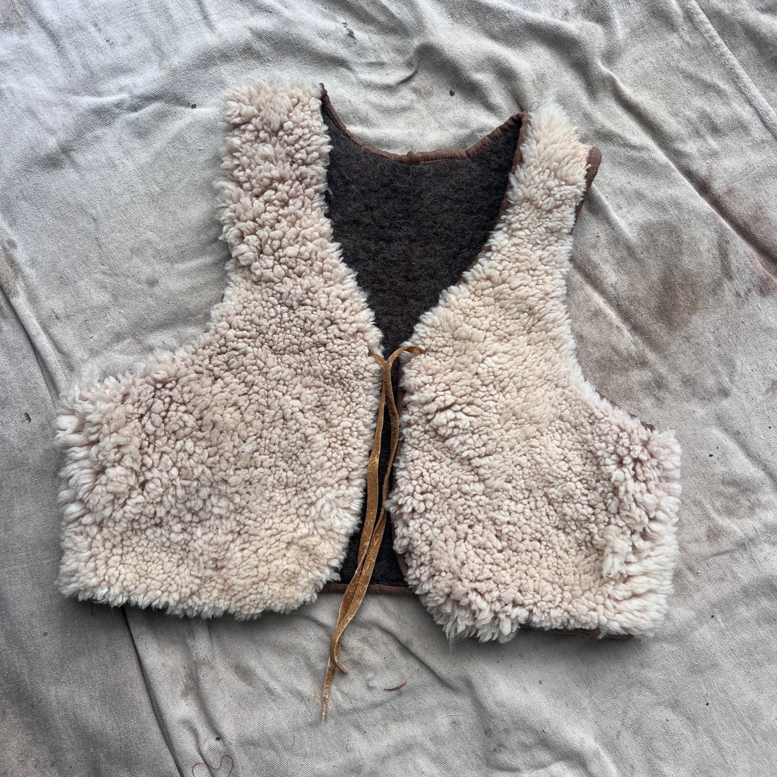 naturally tanned sheepskin and hand felted wool vest is reversible and can be worn with wool out for extra weather protection (wool is water resistant!) or wool in for ultimate warmth. trimmed with brown linen and closed with a simple buckskin tie provides the grounding smell of smoke
