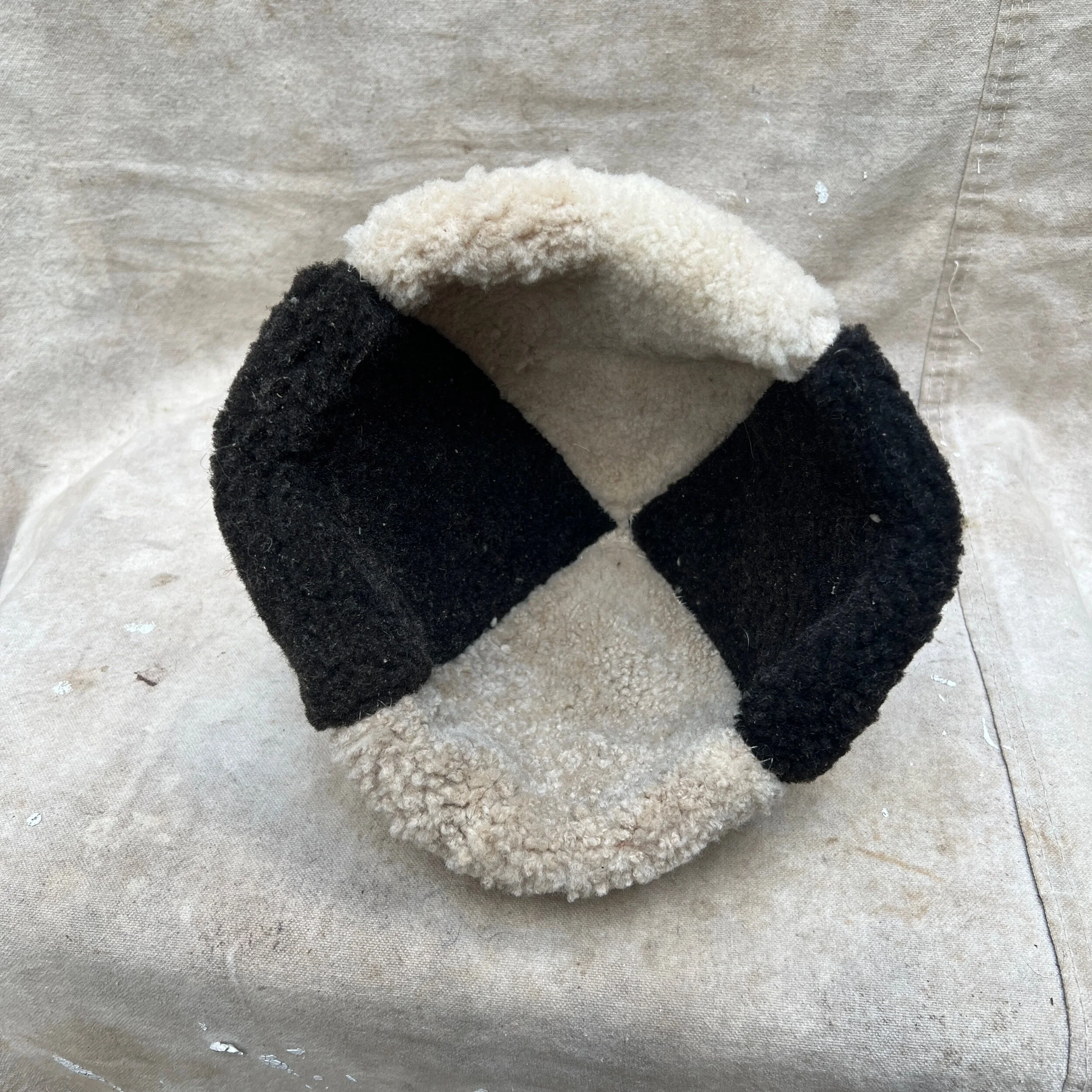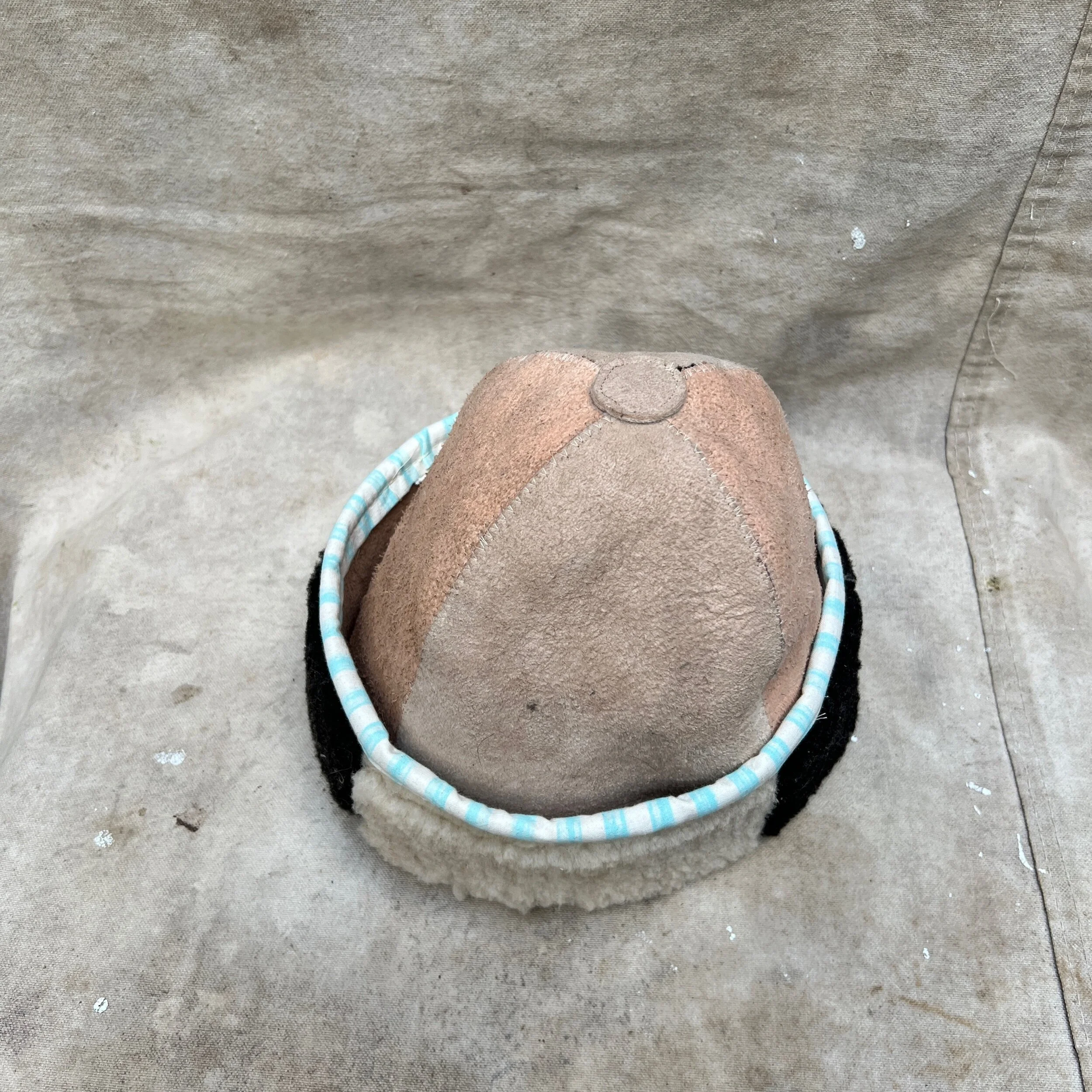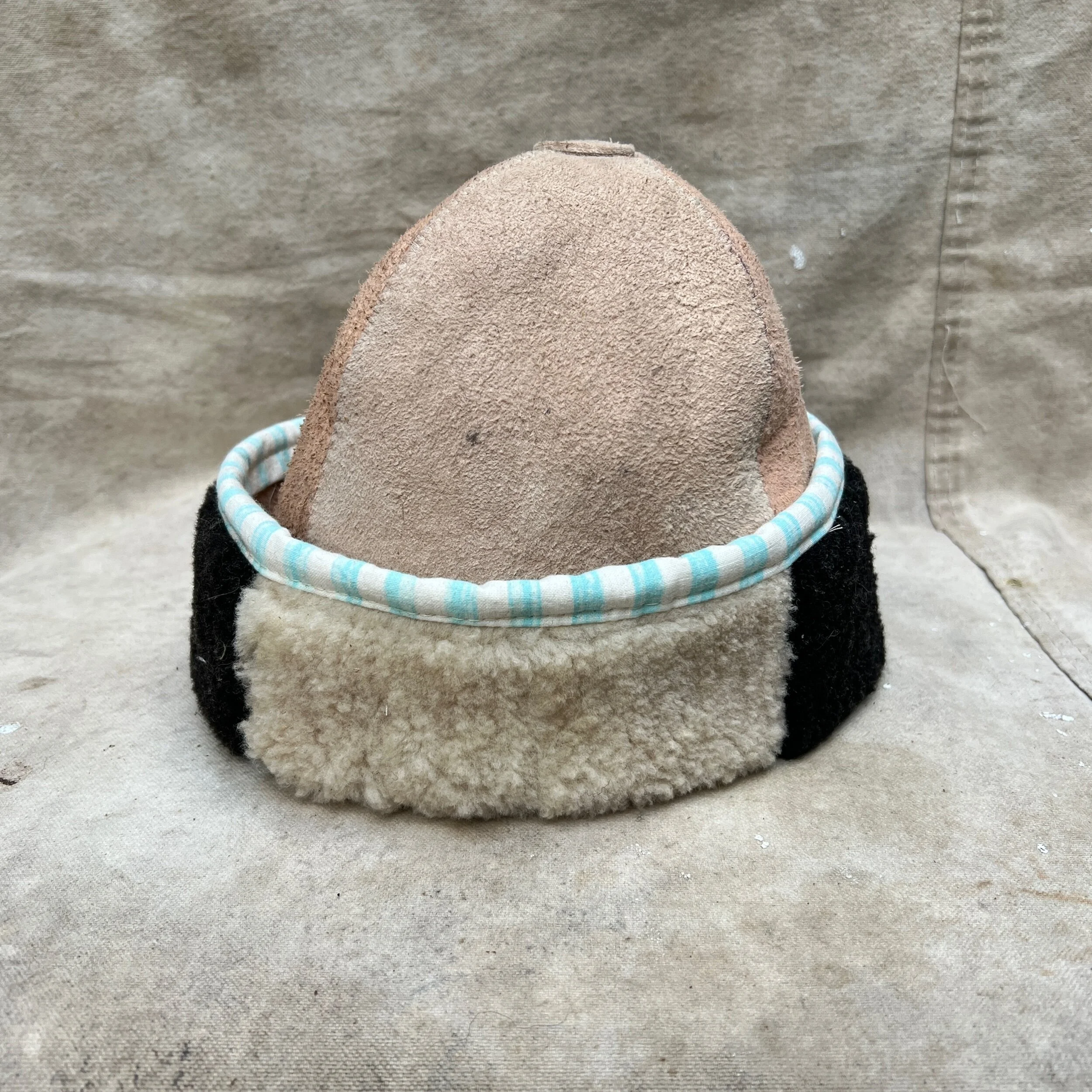 4 paneled sheepskin cap made with organically tanned sheepskins. fold can be adjusted to sit lower over the ears or higher for a truly ancestral look. cap measures 24” circumference