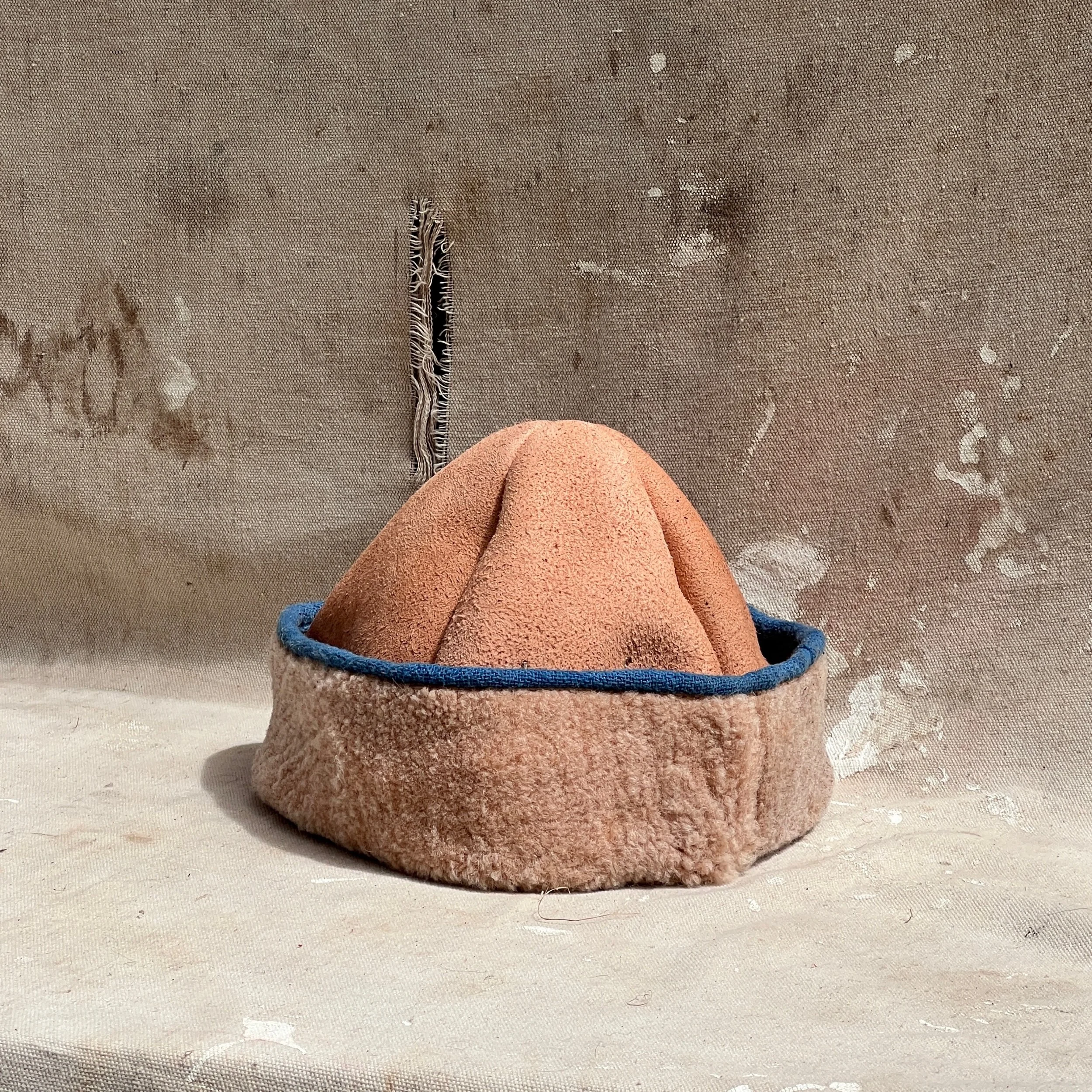 our beloved cap style with full wool inside and a folded wool brim for the ultimate warmth. trimmed with indigo dyed fabric. only a large available in this style.