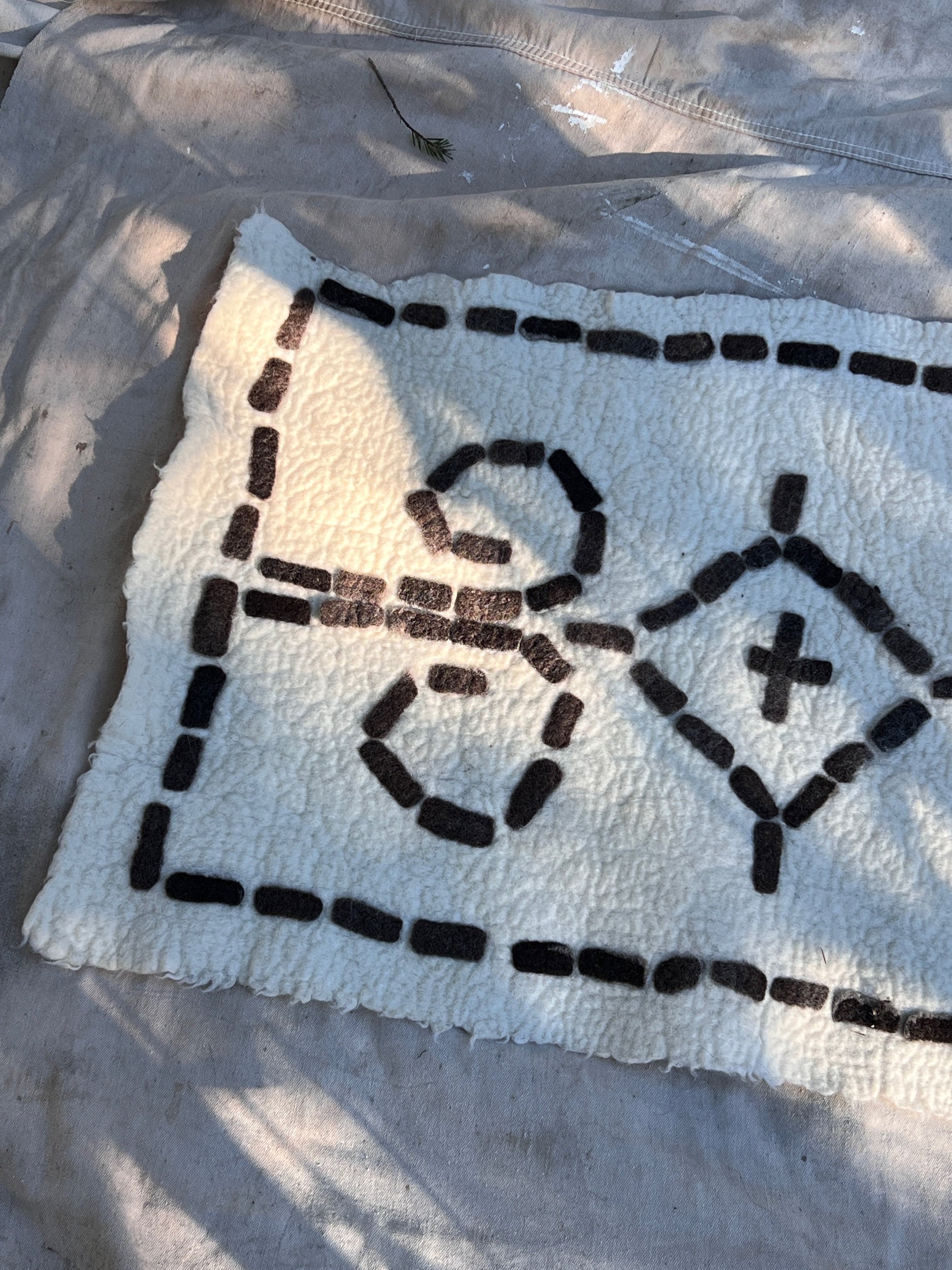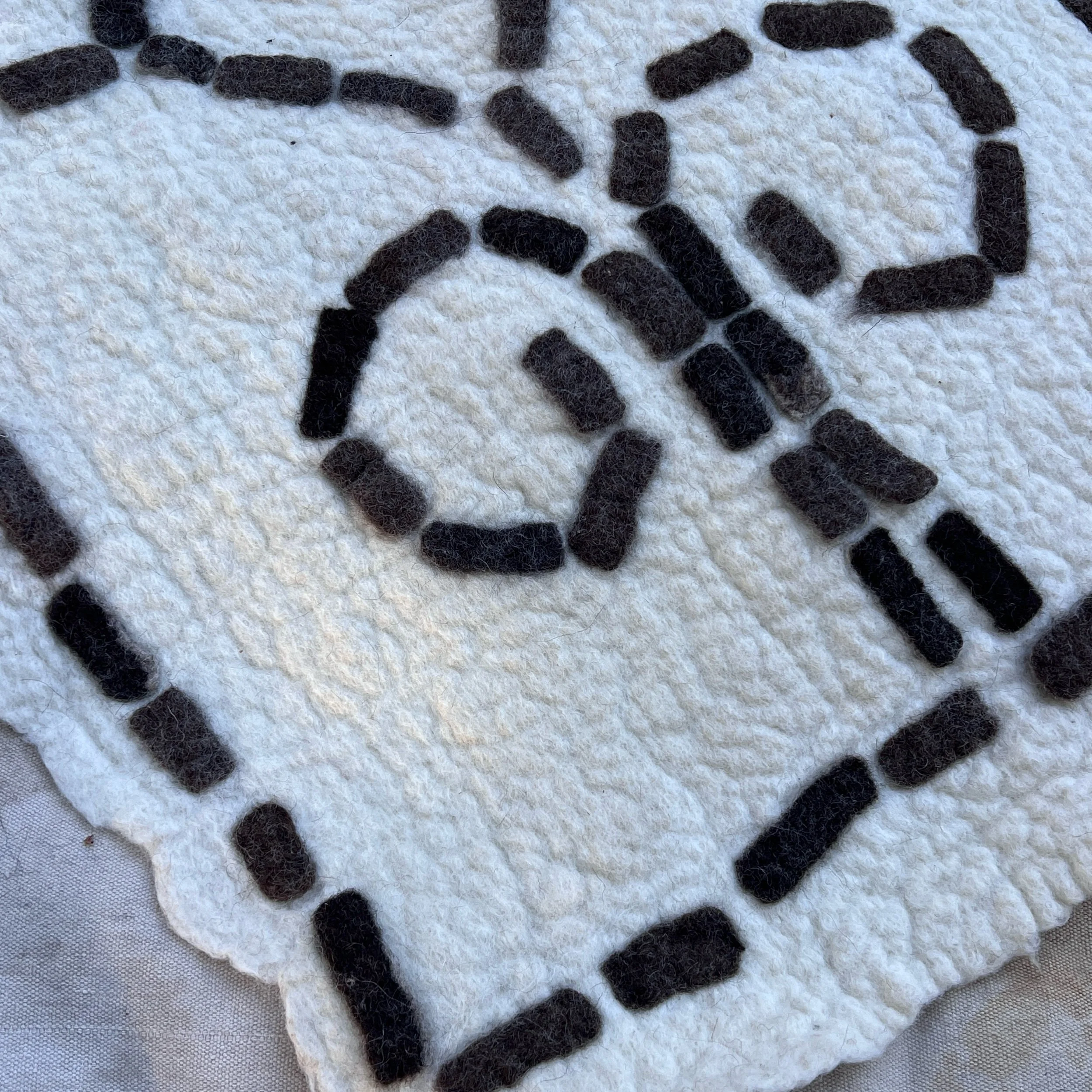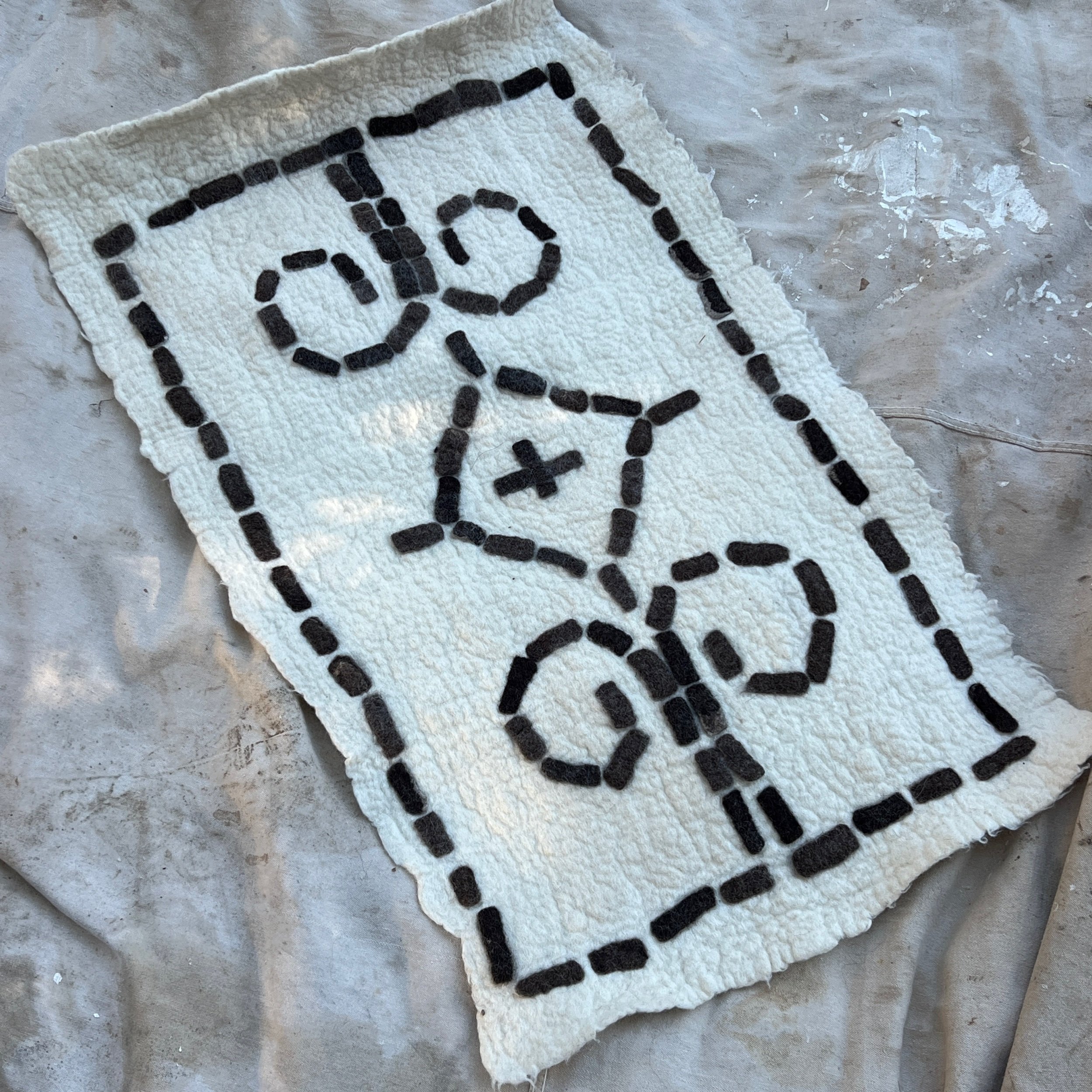 felt on felt. white merino wool base with felted tiles placed in symbolic decoration. can be a wall hanging or rug to bring balance into any space.