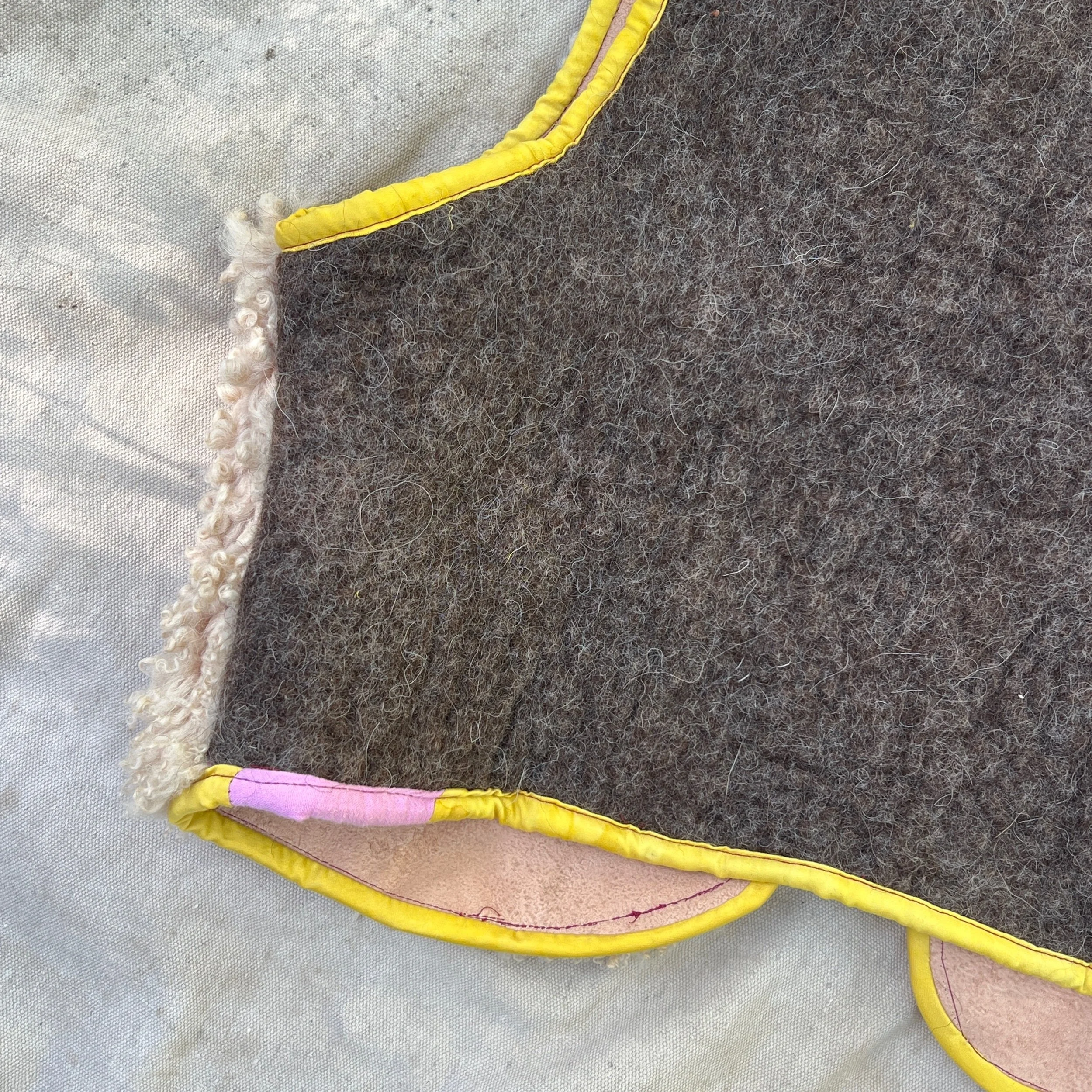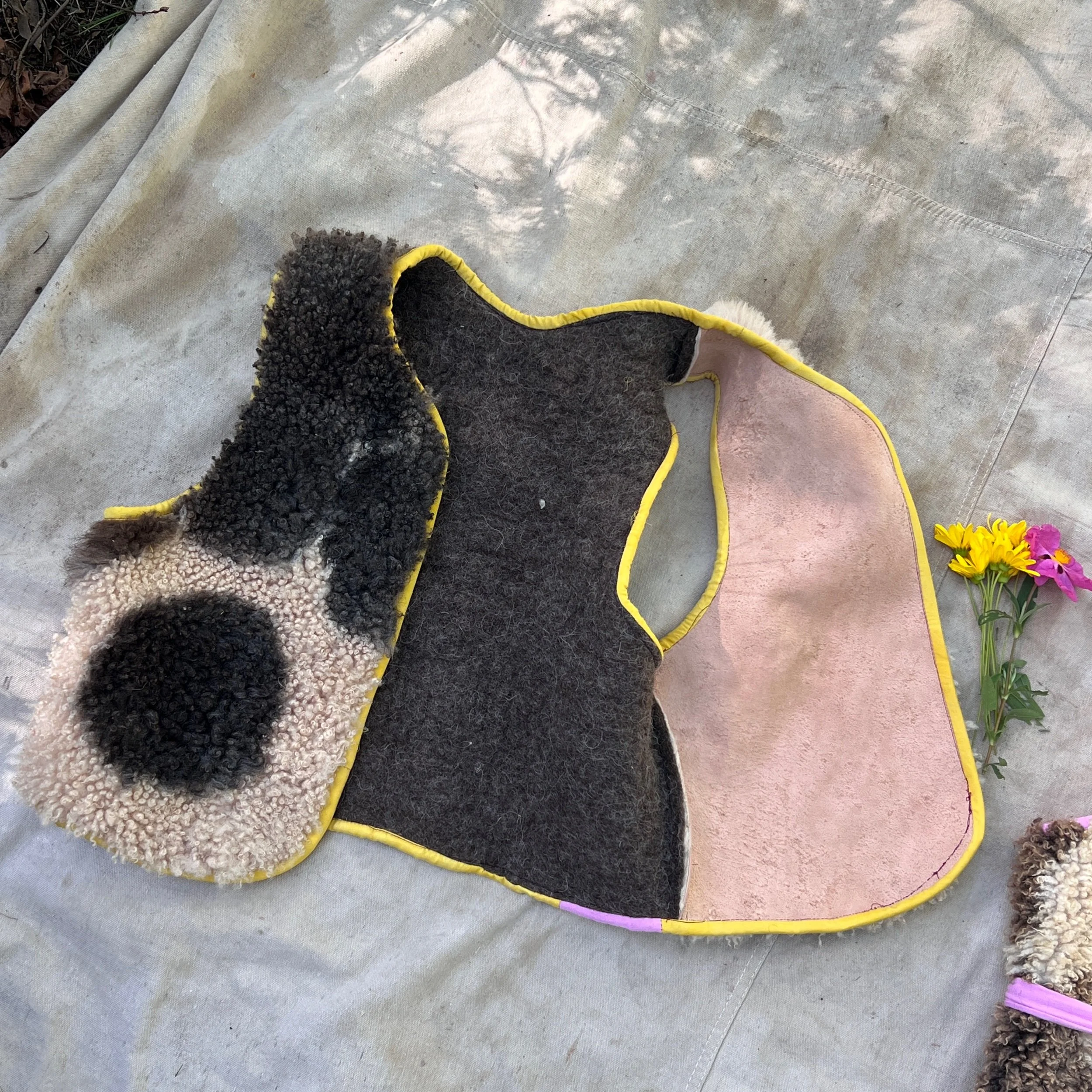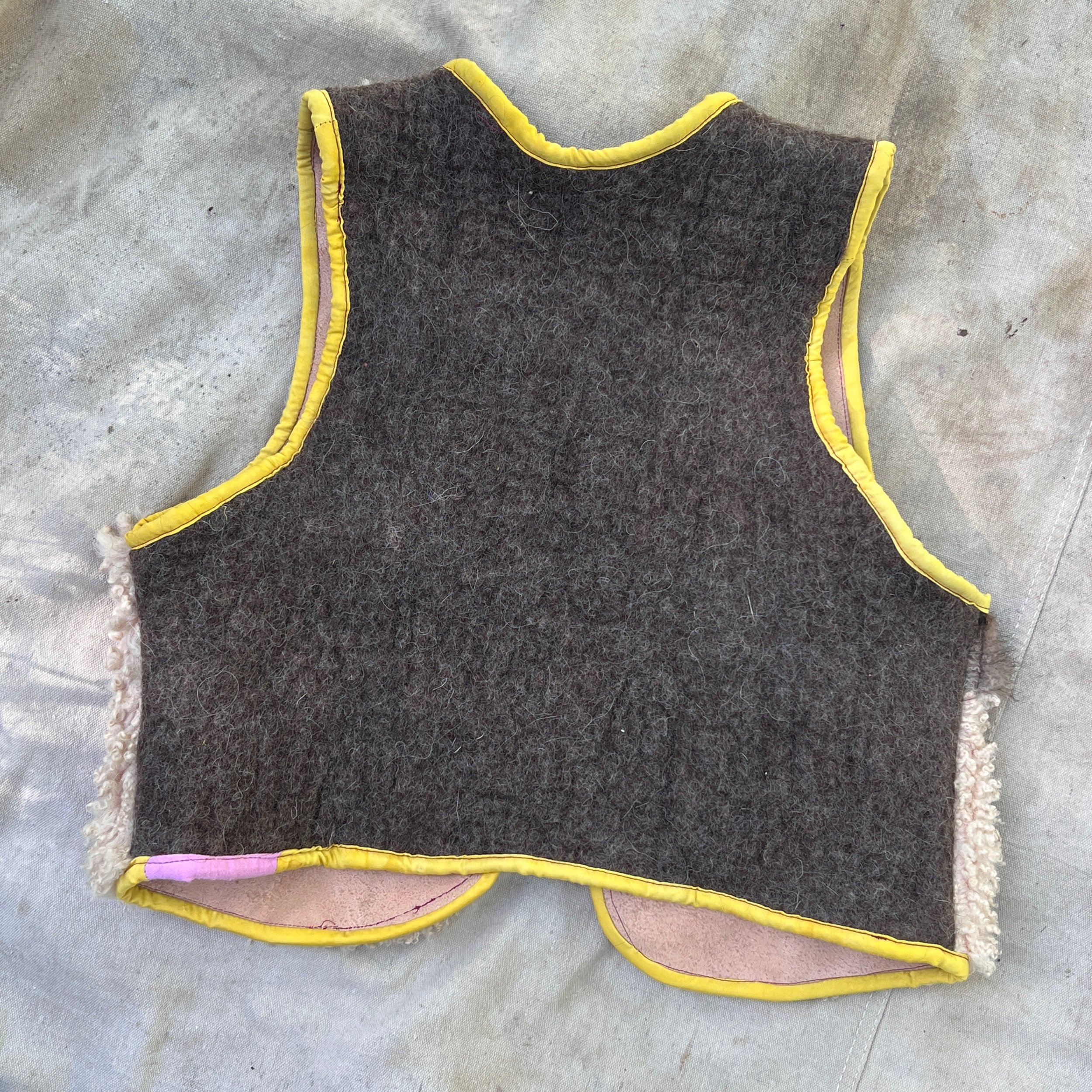 bringing the seasonal color inspiration to our beloved spotty vests. made with naturally tanned hides and backed with felted merino and trimmed with marigold dyed silk.