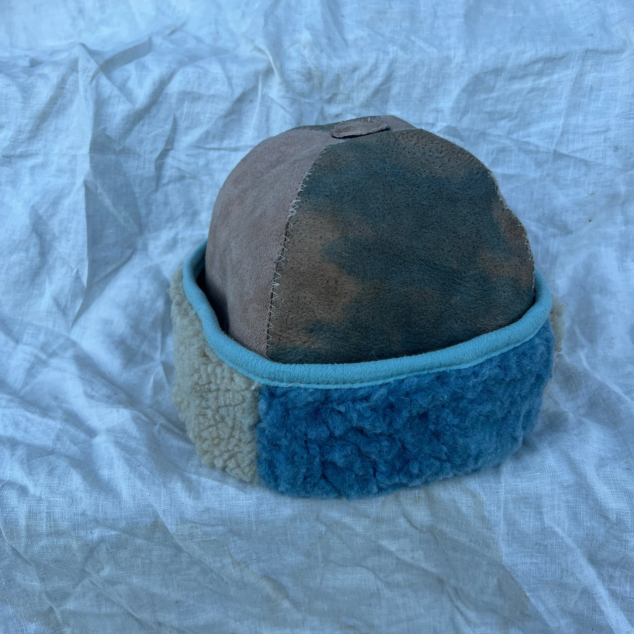 4 paneled cap made from organically tanned sheepskins and linen/raw silk binding. made to sit comfortably on your head and bring warmth and protection.